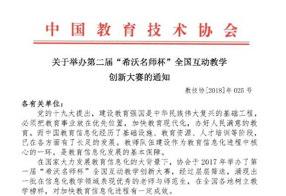 因此,为了更好地帮助教师队伍的建设,聚集更多信息化教学教师楷模,发挥标杆作用,搭建更丰富多样的教育资源展示与共享的平台,同时为更好地贯彻《教育信息化“十三五”规划》精神,从师范生的培养开始,加强信息化教学理念的深入,结合信息化企业提供的信息化教学应用技术,全面提高师范生的综合素质,中国教育技术协会已在2018年4月17日在全国范围内开展第二届“希沃名师杯”全国互动教学创新大赛。