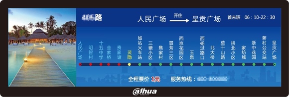 大华新一代LCD智能车载电子报站屏,采用工业级液晶显示屏,动态显示车辆行驶信息,例如行驶方向、到站离站信息等,具有广告循环播放以及车辆运营时间等公共信息播放功能。