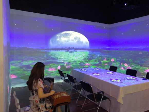 近年来,创意型餐厅越来越受到广大吃货的欢迎,因此通过环形拼接和桌面投影等方式,在餐厅四围进行投影,营造沉浸式用餐环境的情景餐厅逐渐成为了投影行业的热点方案。本次中航国画通过4台LP80UL双色激光工程投影机,投射出拼接长度为13米高度为3米的沉浸式画面,展示荷塘月色、夏日海滩两个主题场景,同时配以桌面投影,让美妙的光影在美食中流动,让人心情愉悦,视觉和味觉同时得到满足。为了更好的塑造餐厅环境,每逢整点还邀请了艺人进行古筝表演,五音、五色、五味水乳交融,成为了展馆现场的最大焦点。据悉,成都是美食之都,是中国餐馆最多的城市。本次国画因地制宜,在成都IFC展会部署情景餐厅方案,给当地人们带来不一样的美食美景新体验。