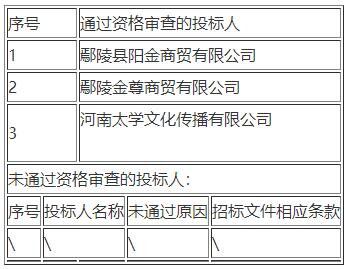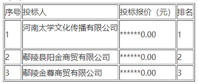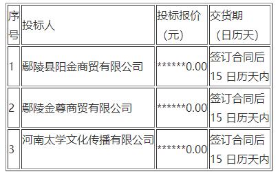 第一中标候选人:河南太学文化传播有限公司投标报价:******0.00元 交货期:签订合同后15 日历天内