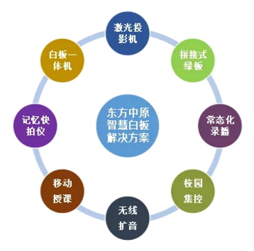 东方中原智慧白板解决方案是以东方中原激光投影机作为显示载体,搭配东方中原拳头产品“白板一体机”作为其智慧核心,再通过一体化拼接或模块化扩展,结合包括拼接式绿板或白板、记忆快拍仪、录播模块、移动授课软件、无线扩音模块、校园集控软件等有机形成的,是最新一代的智慧多媒体解决方案。