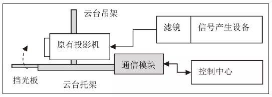 为了解决现实问题,引入了智能化云台控制系统。这里的云台控制系统并不是泛指当前监控系统中广泛使用的摄像头云台(Cradle Head Camera),而是针对现代投影机所特设的一种革新式的结构,如图2所示,从而使舞台多媒体综合投影系统可具备很好的通用性、灵活性。智能化云台控制系统通过硬件和软件的定制改装, 将机械云台和投影机内的控制协议转化成DMX512(Digital Multiplex)协议(国际演出行业的数字通信标准),使得其能够适用于任何使用该协议的设备。
