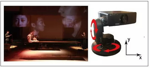 在舞台演出中,投影一般被用于将数字影像投射在舞台景片之上。基于这一应用现状,投影设计往往需要考虑投影介质(surface)位置而采用多台投影机。如果在舞台上需要在多个位置进行投影,如图3中的左图需要投射3个位置,则需要安装3台投影机进行投影。这一现状往往会增加舞台演出时投影机的台数。而基于智能云台的舞台多媒体综合投影系统则可以利用智能云台系统的机械旋转装置及电子控制的动态对焦,使用一台投影机就可以完成对3个位置的投影(见图3中的右图)。