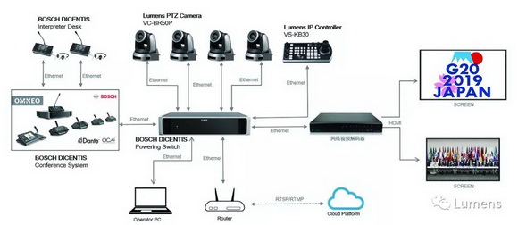 2019年6月,G20峰会首次在日本大阪举行,各国首脑齐聚于此。本次大会共有大小二十多个论坛会议,对音视频服务商设备的稳定性、IP化、即时同步性、品牌兼容性等方面提出了极高要求。Lumens高清会议摄像机VC-BR50P及网络键盘控制器VC-KB30凭借优质品质、性能、超高稳定性等特点,搭配BOSCH会议系统,共同为G20峰会保驾护航。