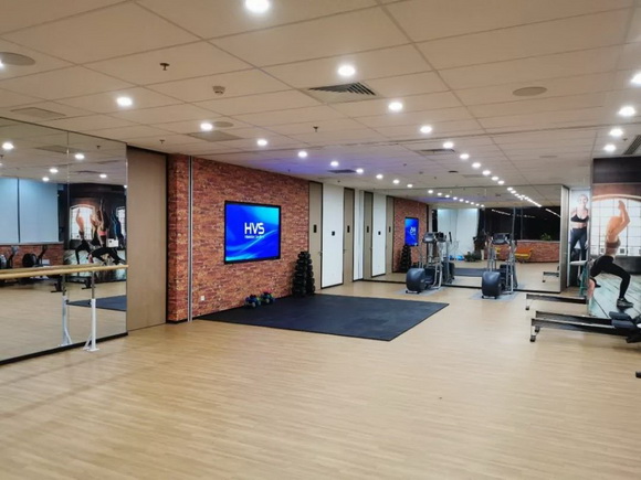 占地130m² 的健身空间,使用86”高清显示器,支持本地高清输入和无线投影,搭配手持麦克风、领夹麦克风和天花吸顶音箱,让人在健身娱乐的同时更加放松身心。