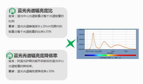 《规范》的出台引发了全社会的热议。《规范》从亮度、对比度、色域覆盖率(Rec709)、清晰度、分辨率、响应时间、闪烁七个指标来评价显示性能,以此来确保产品显示效果更加丰富。在视觉健康方面,规范要求:蓝光光谱峰值波长±20nm范围内的能量占整个光谱能量的比例≤35%;蓝光光谱辐亮度降低率≥30%,从蓝光光谱辐亮度比、蓝光光谱辐亮度降低率两个指标来评价蓝光辐射程度,以此来确保产品的光生物安全性。规范还要求产品工作噪声≤35dB(A),以此达到低噪声目的。