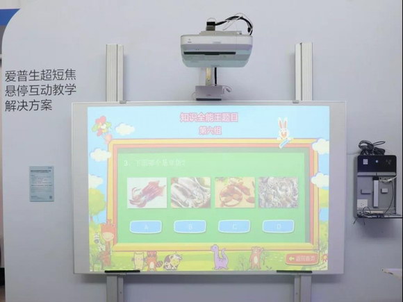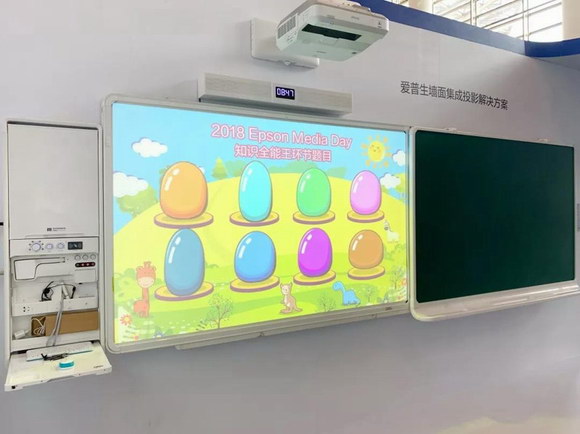 爱普生超短焦悬停活动教学方案和爱普生墙面集成投影解决方案则可使画面投影呈像更加灵活。爱普生超短焦悬停活动教学方案是由超短焦互动投影机、推拉式轨道以及白板组成,可自由上下推拉屏幕。该方案不仅外观简洁大方,能够营造整洁的教学环境;在授课过程中,老师和学生还可以根据自身情况随时调整屏幕高度,更适合小学和幼儿园等学生与老师身高差异较大的教学环境,以保证学生的可视范围,课堂互动更灵活高效。此外,该方案还支持6点手指互动+2点互动笔同步触控,师生可以轻松地在投影屏幕上书写文字及拖动课件。