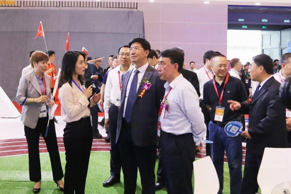 ▲广西教育装备行业协会会长陈铁华等一行莅临锐取展位参观指导