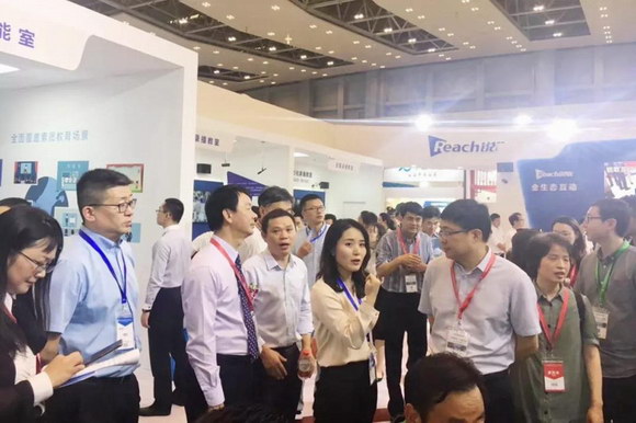 ▲深圳市教育局副局长赵立,深圳市教育信息技术中心主任张惠敏,深圳市教育装备行业协会会长彭锦环等一行莅临锐取展位参观指导
