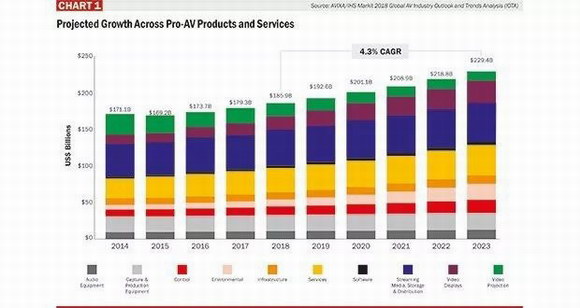 根据IHS Markit和AVIXA协会的数据显示,全球范围内,专业视音频解决方案和服务市场持续增长。2018年,全球音视频行业的市场规模1860亿美元,在未来的5年,也就是2023年,这一规模有望达到2300亿美元,折合4.3%的年复合增长率。