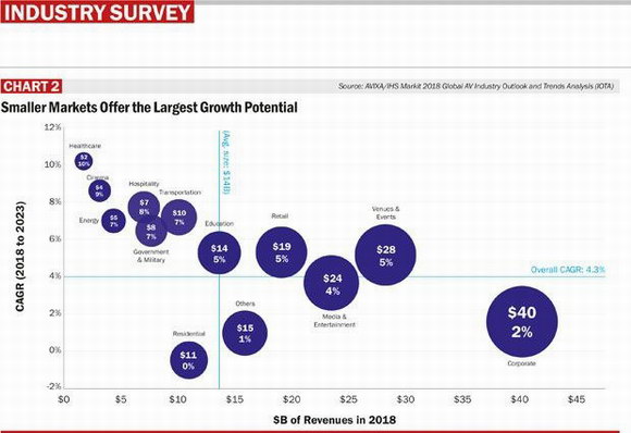 同时,还有其他一些值得预期的市场可以增长。AVIXA发布了一系列报告,研究了AV解决方案和服务增长最快的市场。这些市场机会分析报告(MOAR)对每个领域进行360度全面审视,不仅分析了进入渠道的AV产品的价值,还分析了市场中AV解决方案提供商的调查,以及在这些市场中运营的公司的决策者 ,以及终端用户——零售空间的购物者或酒店的客人。