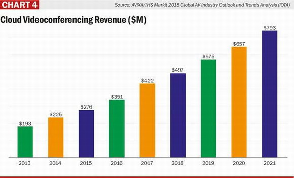 在完整的解决方案集方面,会议和协作是专业视听销售的主要推动力。尤其是教育和企业市场,对会议和协作的需求日益增长。而会议和协作的很多需求现在都是通过云视频会议服务来满足的。IHS Markit和AVIXA最近的IOTA研究,预计全球云视频会议收入去年约为4.97亿美元,预计到2021年将达到7.39亿美元。