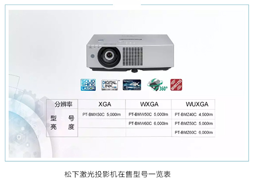 今年6月份松下推出的激光投影机PT-BMZ60C、PT-BMW60C两款新机型,亮度高达6000流明,基本可以满足部分工程项目的使用需求。松下激光投影机光源寿命长达20000小时,亮度4500lm-6000lm,动态对比度3,000,000 : 1,覆盖XGA \ WXGA \ WUXGA分辨率,是一款兼顾高亮度、高倍变焦、镜头位移、无线投影、便捷维护、健康护眼、高效防尘与紧凑机身为一体的新产品。