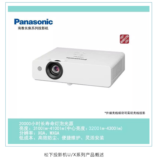 松下20000小时全新灯泡投影机PT-UX425C、PT-X426C系列,亮度达3100lm-4100lm(中心亮度3200lm-4300lm)兼具长寿命、低成本、持久耐用、售后无忧的特点。松下U/X系列除了在教育市场有着超高性价比外,在商务领域、公共应用领域也有精彩表现。