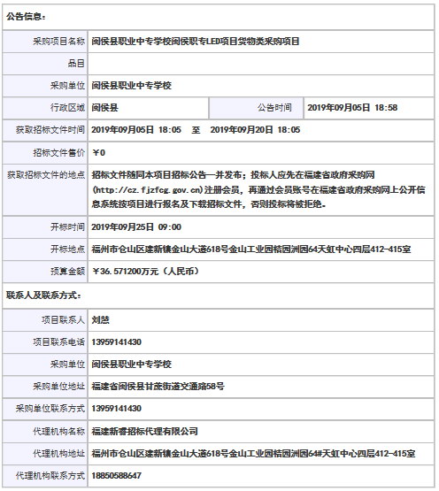 闽侯县职业中专学校闽侯职专LED项目货物类采购项目