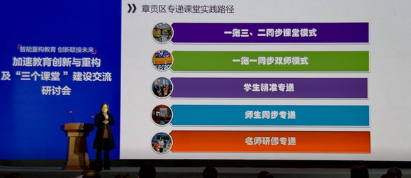 江西赣州市章贡区也作了交流分享。章贡区教体局电教室主任陈旭军表示,该区通过完善机制、改善环境、提升队伍、树立标杆和融合应用五大举措,已形成了“以建设‘专递课堂’为先导,以推进‘区域网络研修’为主线”的应用模式。此外,对于如何推动“三个课堂”有效实施?她认为,需要电教给力支撑、基教聚力推动、教研合力提升。“三个课堂”覆盖面广、影响力大、要求更高,是点的凝聚,要夯实底盘;是线的延伸,要内化结构;是面的辐射,要共享智慧;是体的旋转,要绽放精彩。