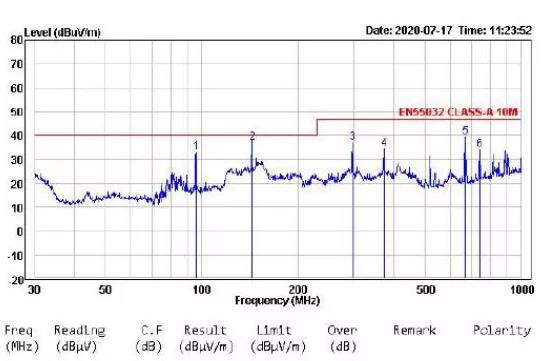 我们在DEKRA德凯进行的传导发射试验、30MHz~1GHz辐射发射试验、1GHz~6GHz辐射发射试验结果,达到EMC的A级标准。