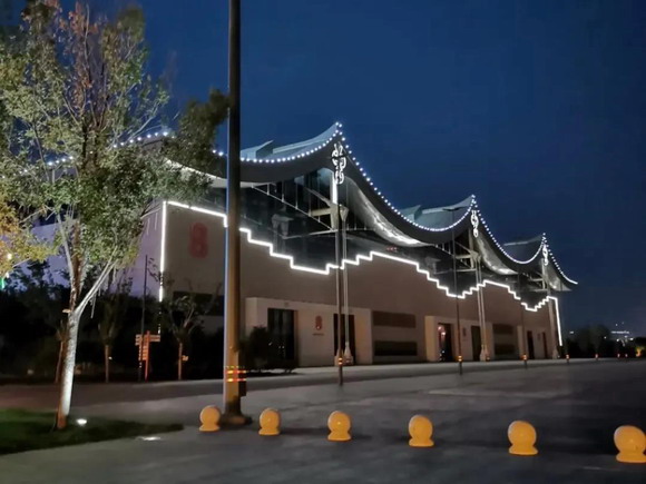 会展中心建筑形态上采用赵州桥和滹沱河的意象,取“碧水宏桥”之味、融千年古城之精。洲明康利在照明设计中延续了这一特色,将正定的古城风韵和现代时尚融合,呈现出亦新亦古、亦雅亦俗的新风貌。