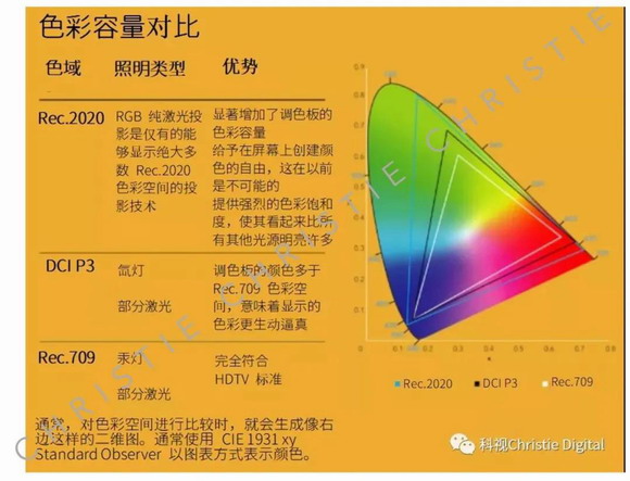 每种照明技术匹配不同的色域,RGB 纯激光照明是最接近显示全部 Rec.2020 色域的照明技术。