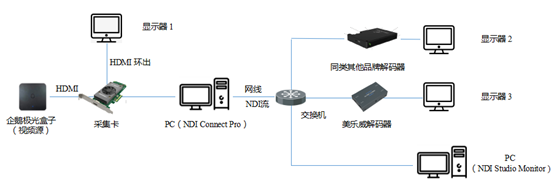 在搭建完以上测试环境后,我们将解码端软件编码尝试切换成Magewell Pro Convert HDMI 4K Plus编码器(下面简称“美乐威NDI®编码器”)和同类其他品牌编码器进行硬件编码测试,其他设备不做改变。切换后的设备搭建如下图: