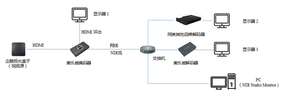 图2: 编码端统一使美乐威NDI编码器生成NDI流,解码端使用两种品牌的硬件解码器和一款软件解码