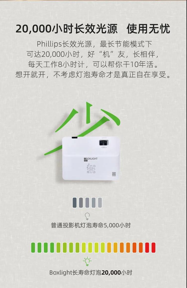 金属卤素灯泡价格便宜,一般使用2000小时左右亮度会降低一半。UHE灯泡价格适中且发热低,在使用2000小时后亮度几乎不衰减,是目前广泛采用的理想光源。UHP高能灯发热较少且使用寿命长,一般可以正常使用4000小时以上,并且亮度衰减很小,但价格昂贵。Boxlight智能A3是长寿命的UHP灯泡,是高性价比的优选产品。