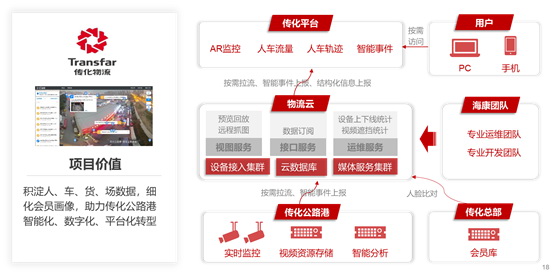 海康威视与传化物流深度合作,开发打造传化专属的物流云平台,联动传化平台及传化公路港,传化总部等产品服务,实现人、车、货、场数据连通,细化会员画像,助力传化公路港的智能化、数字化、平台化转型。