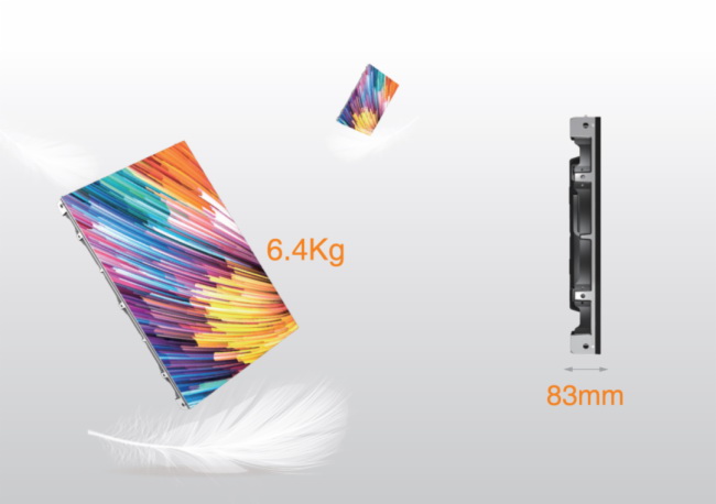 单箱体轻至6.4Kg,薄至83mm,搬运方便,安装灵活。可实现旋转安装,前后安装、落地安装和吊装,满足各种拼接尺寸需求和不同的应用场景。同时支持户外裸装,无需包边,客户更加节省成本。