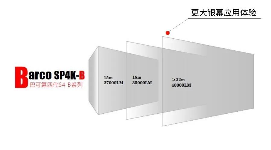 此时此刻查阅Barco官网,就能发现S4产品家族已经新添了新成员SP4K-B系列。SP4K-B系列包含三款机型SP4K-27BHC,SP4K-35B,SP4K-40B,流明覆盖27000流明,35000流明,40000流明,提供15-22米以及22米以上的中大型影厅的“单机系统”放映方案。不仅能够节省影城初期成本,更能简化影院日常运营工作。