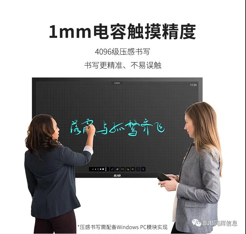 搭配智能笔在白板书写上,可以体验到4096级的压感,即实现笔锋书写,文字的钩、撇捺等笔画或遒劲有力,或曲折多变。俨然一个电子书法展示的平台。