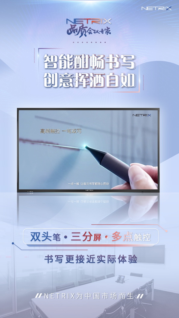 以NETRIX智能交互平板为首的数字化办公设备,集产品稳定性、互动性、易用性和流畅性等多方面优势于一身,通过提高会议效率,改善会议环境,降低运营成本助力政企实现数字化、智能化的全面升级,领跑数字化转型热潮。NETRIX专为中国市场设计、研发、制造,拥有独特的4K超高清显示、流畅的智能书写及快速的无线投屏等功能设计。