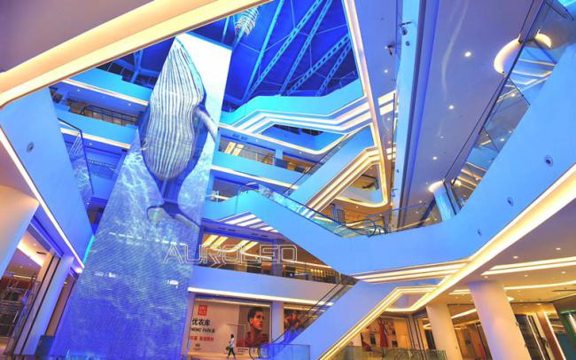 而在上海鄂尔多斯商场,透明屏不仅起到了环境装饰的作用,而且还助力打造沉浸式购物体验,酷炫夺目的透明广告激发了消费者购物、游逛的欲望。