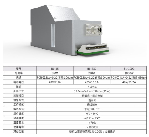 传统的工业加工、切割一直是红外激光的天下,但随着5G应用、新能源汽车等行业的发展,针对越来越多的有色金属加工需求,红外激光渐显不足。蓝光激光波长短,有色金属的对蓝光的吸收率超红外最高可达20倍,因此大功率的蓝光激光模组需求短缺。BL系列产品可实现从35W到上千W的光功率输出,在锂离子电池、电子产品封装、汽车制造、激光熔覆、表面强化处理等领域有着广泛的应用。