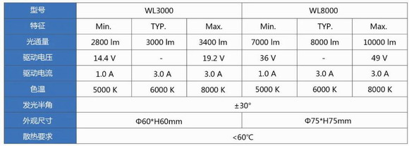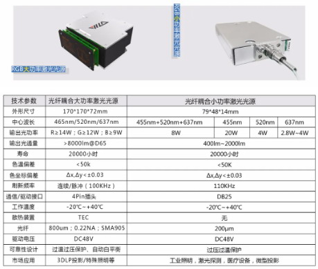 采用蓝光激光激发荧光材料混合为宽光谱白光,其输出光通量可达8000流明以上,具有显色指数高,光束准直性好,寿命长的优势,主要应用于投影显示、汽车车灯、舞台灯光等领域,尤其在替换传统的汞灯、LED具有极大的优势。