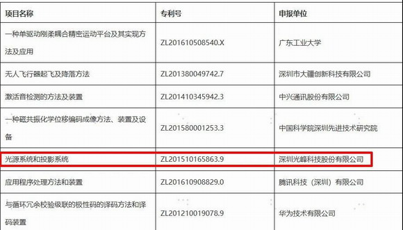 据不完全统计,除光峰科技外,还有华为、腾讯、大疆三家企业自第五届至第七届连续三届获得“广东专利金奖”,四家企业也分别代表了各自在激光显示、通信、互联网、无人机领域中的创新先锋地位。