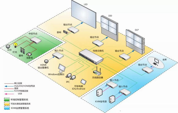 彩讯可视化指挥调度平台由音视频管理系统、KVM坐席管理系统和环境控制管理系统组成。音视频管理系统基于IP网络,传输距离不受限制,不同地点的操作人员通过网络协同工作,共享信号资源,支持各种接口类型的信号,支持GIS、SCADA等高分辨率矢量应用的大屏幕显示,信号源实时显示,保存的场景实现预览并可一键调用。支持触控操作,多种平台可视化操作界面。KVM坐席管理系统支持KVM功能,实现人机分离,一人多机操作,可远程接入各类主机,推送显示画面到指定坐席或大屏显示区域,支持多级分区管理和设置操作权限。环境控制管理功能融合了中控功能,所有设备在统一的可视化界面下完成,实现对音视频参数调整、信号切换、灯光系统调节等周边环境设备控制。系统可兼容多种设备接口,连接控制环境设备,所有的控制操作可保存多个场景,方便一键调用。