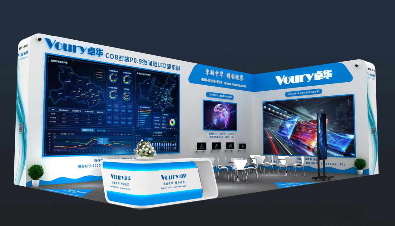 Voury卓华COB封装LED显示屏采用COB一体化封装技术,结合共阴技术、超薄箱体、无缝拼接的设计,配以像素级的点控技术,实现对显示屏像素单位的亮度、色彩的还原性和统一性的状态管控,具有防水、防潮、防磕碰、高亮度、高对比度、高可靠性、颜色亮丽、视觉无缝、屏体轻薄、节能环保等特性,是应急中心、指挥中心、控制中心、会议室、报告厅的理想之选,满足多元化用途,为各行业提供可靠的显示技术,展会现场Voury卓华将展出超高分辨率P0.9/P1.2/P1.5等多款点间距规格的COB封装产品和倒装COB显示屏产品。