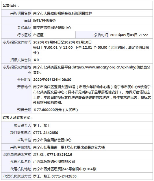 广西邕政采购代理有限公司南宁市人民政府视频会议系统项目维护公开招标公告