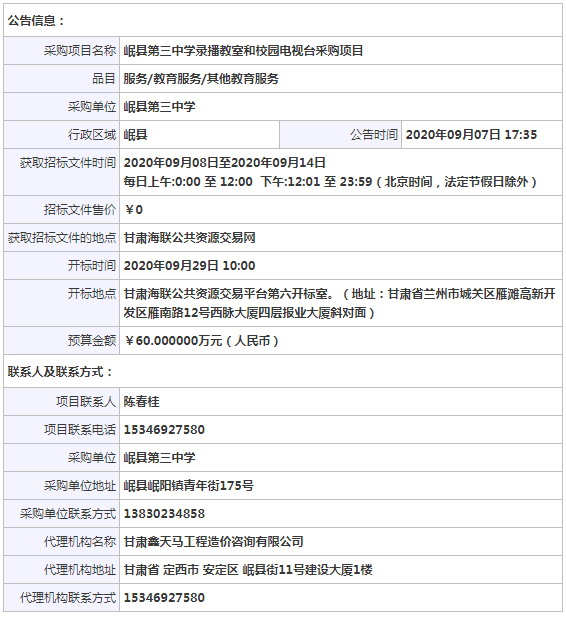 岷县第三中学录播教室和校园电视台采购项目公开招标公告