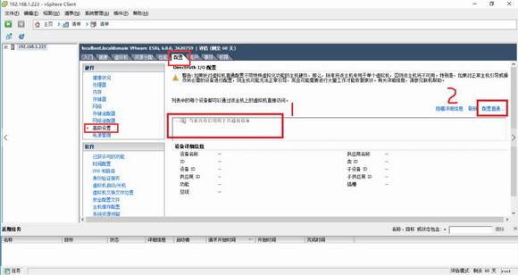 (2)服务器的主机端设置成功后,继续对客户端进行设置。在客户端清单页面,点击配置>高级设置。如图3,此时界面上显示“当前没有启用用于直通的设备”,这是服务器端的采集卡设备还没有启动直通配置(若此处显示其他,则是服务器DirectPath I/O接口未打开)。点击“配置直通设备”为客户端添加采集卡。