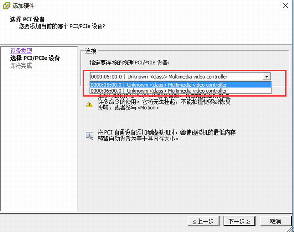 (3)进入配置界面后,如图4所示勾选添加Unknown <class> Multimedia video controller的两个PCI设备,点击确定。(服务器端安装的是美乐威Pro Capture Dual HDMI 采集卡,所以此处显示两个PCI设备,代表这片卡上的两个采集通道)。