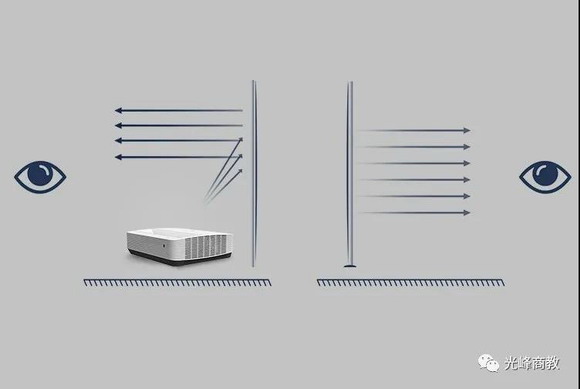 与更多的电子产品,如电视机、液晶大屏的自发光比较,光峰投影显示,是模拟自然界反射成像原理,将光线传输到屏幕上,再经过反射才进入眼睛,避免了传统屏幕的镜面炫光及频闪的问题,这样可以减少光源对眼睛的直射伤害,且投影画面相对于电视机等设备来说亮度也比较柔和。