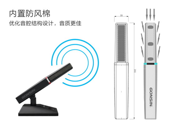 公信领导者系列麦克风采用全金属外壳,现代工业风格的设计彰显着硬朗的整体造型,沉稳大气的产品属性是众多客户选择的理由。该系列拥有14毫米的镀金电容咪芯,配合心形指向性的特点,充分捕捉发言者的声音细节。公信团队重点对音腔结构进行优化设计,在实验室中反复测算,最终定型,保证了最佳的音质效果。同时内置的防风棉和减震胶对咪芯等核心部件起到隔离保护的作用,同时有效隔绝干扰噪音的进入。