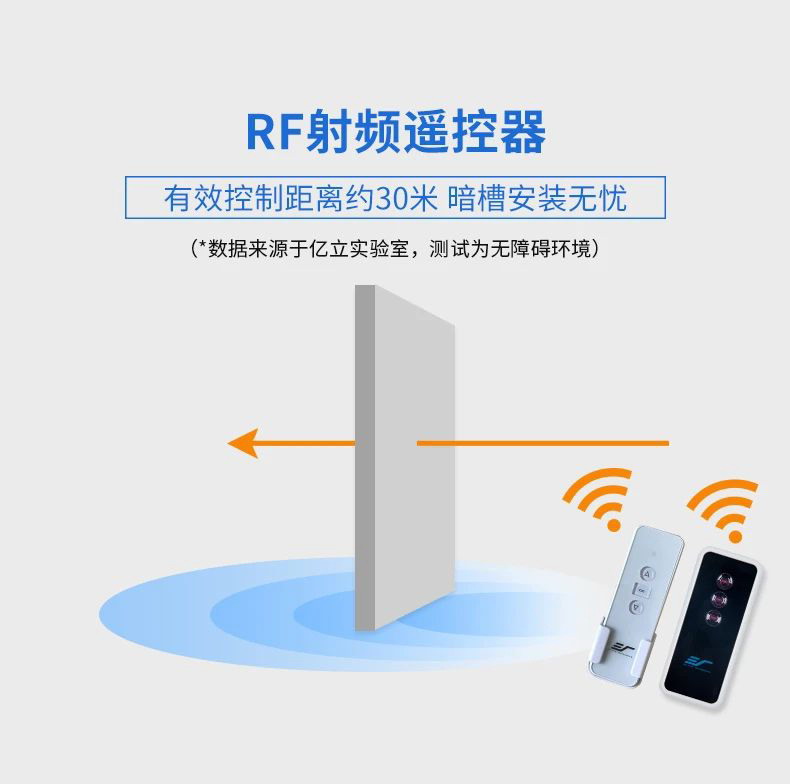 首先我们先来明确一个概念,什么是RF遥控器?RF遥控器利用的是直向传播性较小的电波,在小范围(有效范围)内不需要指向所遥控物即可以实现遥控操作的一种遥控器。有效控制距离可达30米,即使暗槽安装也不影响信号输出。