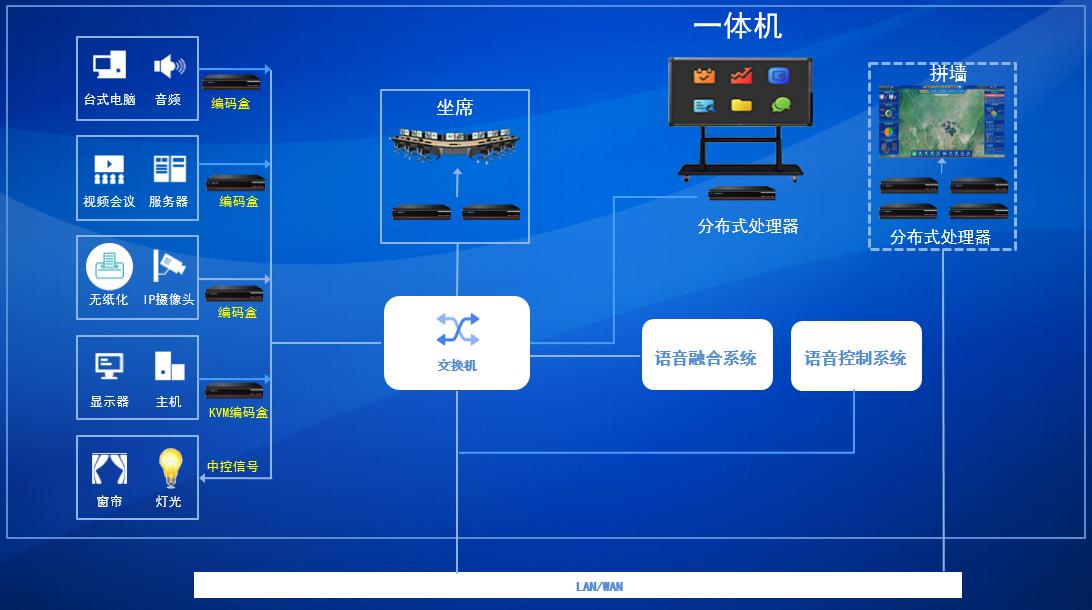 新型的会商室一般都具有信号采集、业务集成与控制、信息调度与分发、可视化综合控制等功能,以满足 “显、控、用”的高效指挥调度,这就需要在会商室部署以下系统和设备: