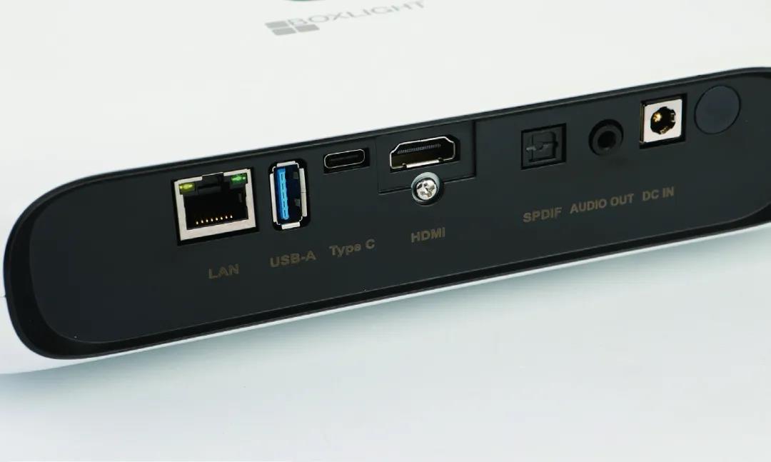 与众多投影机一样,宝视来A1H-W也将接口部分设计在了机身尾部。别看它的机身小巧,但是它的接口却非常全面,常用的接口均有配备,它甚至还搭配了目前主流的USB Type- C接口,能更方便地与移动设备互联。除了Type- C接口外,它还配备了1个HDMI、 USB Type- A(3.0)、RJ45、 SPDIF、3.5mm音频输出接口。同时,位于电源接口旁的圆形部分是它的蓝牙信号接收器。宝视来A1H-W为了减少主机的体积,采用了外置电源设计,电源与很多游戏笔记本电脑相仿,体积有些偏大。另外,我注意到它的接口挡板由于模具开孔比较大,导致与接口间的缝隙比较明显。