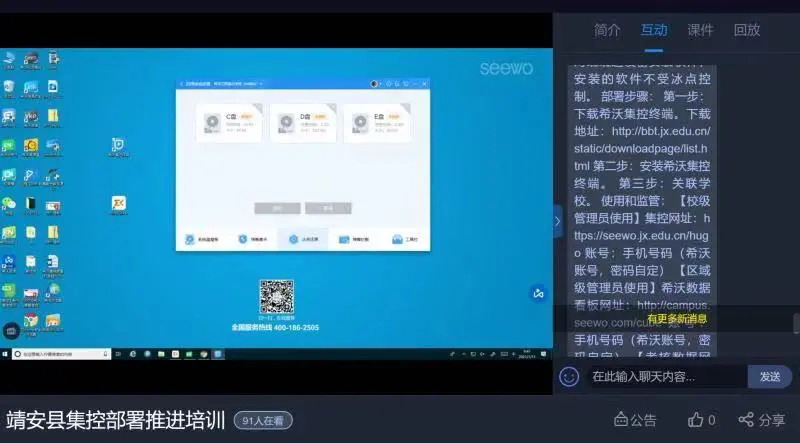线下到位。2020年全省骨干技术人员运维能力培训会在南昌召开,希沃工作人员现场给全省骨干技术老师演示希沃集控功能。2021年1月6日,希沃在“宜春市高质量班班通工作推进会”上,给宜春区县电教站领导演示希沃集控功能。