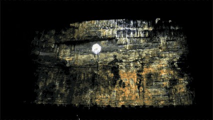 好像在海洋深处探照一束光,在光芒中,观众看到摇曳的海草,盈盈发光的海水气泡像萤火虫一样飞翔在海底,随之而来的光圈变幻莫测。