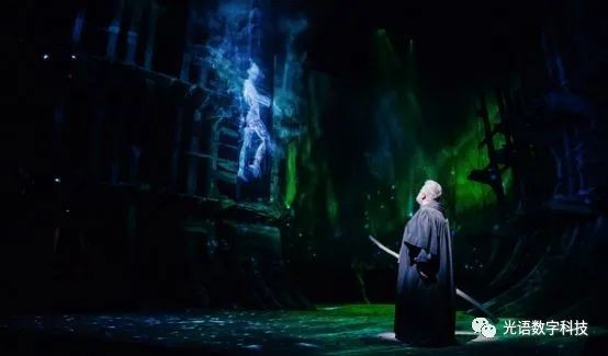 舞台上,一座虚幻的孤岛耸立、剧情自带的神话色彩,魔法、精灵等,经动态捕捉,实时渲染,借助3D视频投影,营造出逼真的3D表演效果。