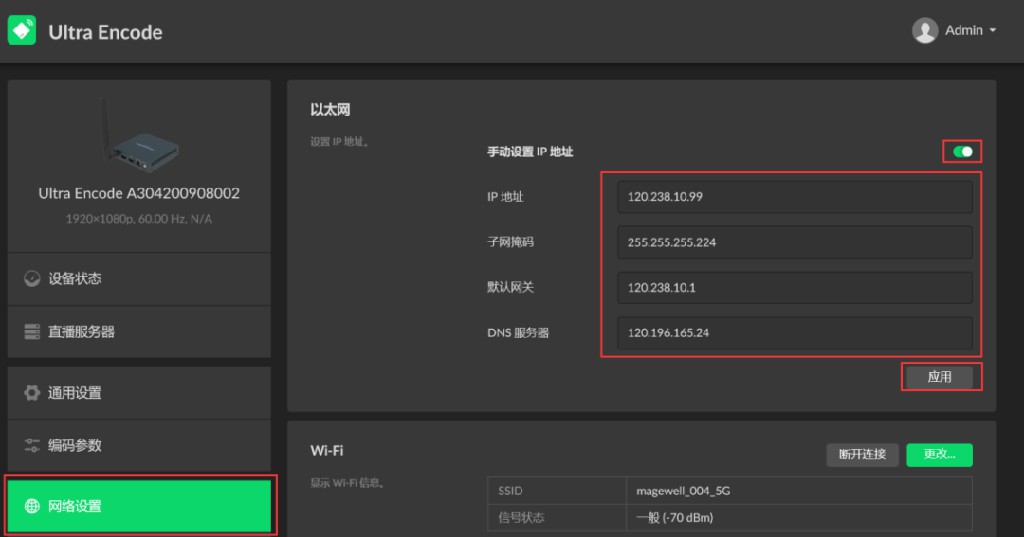 1、登录编码盒Web GUI,进入“网络设置”页签。在“以太网”页面中打开“手动设置IP地址”开关,填写IP地址、子网掩码等信息(IP地址需要为公网固定IP地址),点击“应用”。